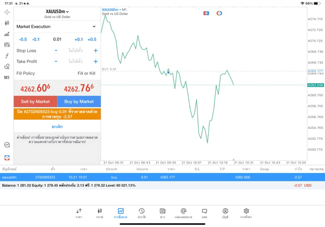 คลิ๊กปุ่มสีส้ม ปิดการเทรดทองคำครั้งนี้ ราคายังเปลี่ยนแปลงยังส่งผลต่อกำไรขาดทุนหากยังไม่คลิ๊กปิดสถานะ