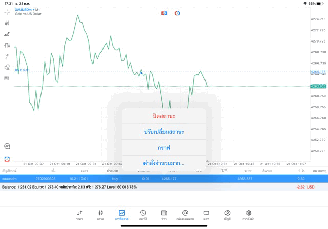 คลิ๊กค้างบนการเทรดที่ต้องการปิด แล้วเลือก ปิด