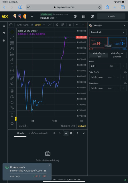 ผลการลงทุน -125.62$ เปิดไว้ต่อ หรือ ปิดการซื้อขายครั้งนี้เลย ถ้าเปิดไว้ ราคาทองคำเปลี่ยนแปลงยังส่งผลต่อผลกำไรขาดทุน อาจ บวก ลบ อะไรก็เกิดขึ้นได้ ลบอยู่อาจบวก บวกอยู่อาจลบ อาจบวกเพิ่มขึ้น อาจลบเพิ่มขึ้น (ภาพล่าง)