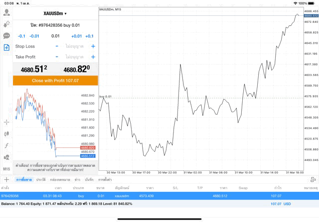คลิ๊กปุ่มสีส้ม ปิดการเทรดทองคำครั้งนี้ ราคายังเปลี่ยนแปลงยังส่งผลต่อกำไรขาดทุนหากยังไม่คลิ๊กปิดสถานะ