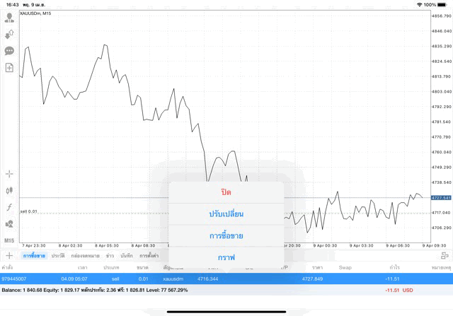 คลิ๊กค้างบนการเทรดที่ต้องการปิด แล้วเลือก ปิด