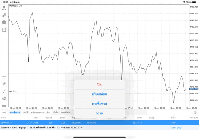 คลิ๊กค้างบนการเทรดที่ต้องการปิด แล้วเลือก ปิด