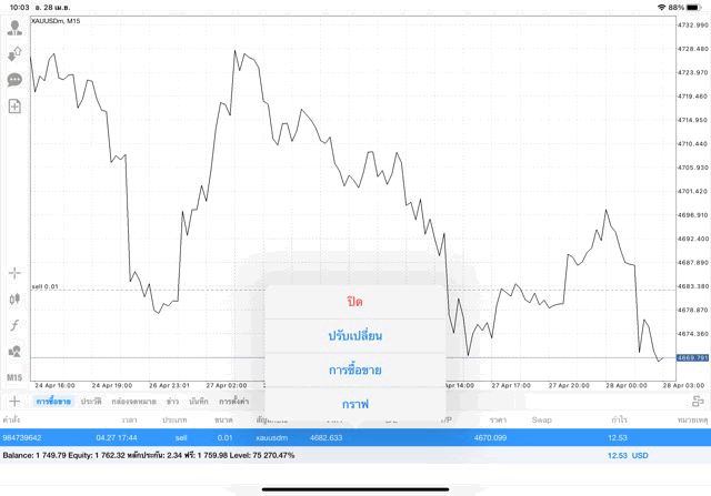 คลิ๊กค้างบนการเทรดที่ต้องการปิด แล้วเลือก ปิด