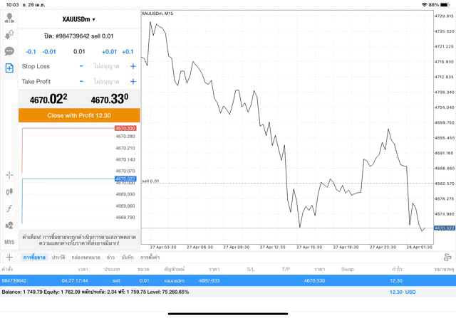 คลิ๊กปุ่มสีส้ม ปิดการเทรดทองคำครั้งนี้ ราคายังเปลี่ยนแปลงยังส่งผลต่อกำไรขาดทุนหากยังไม่คลิ๊กปิดสถานะ