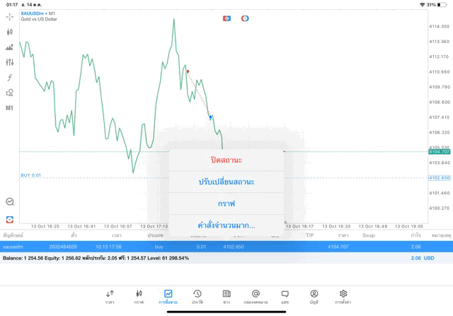 คลิ๊กปุ่มสีส้ม ปิดการเทรดทองคำครั้งนี้ ราคายังเปลี่ยนแปลงยังส่งผลต่อกำไรขาดทุนหากยังไม่คลิ๊กปิดสถานะ