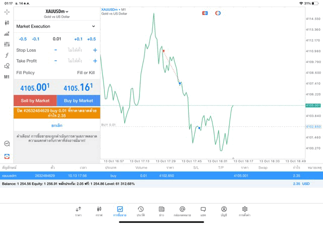 การเทรดทองคำ 0.01 lot บนแอปเล่นหุ้น Meta Trader 5 หรือ MT5 กับ exness โบรกเกอร์ Forex และ การเล่นหุ้นออนเน็ตที่มีปริมาณการซื้อขายสูงที่สุดในโลก