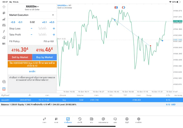 คลิ๊กปุ่มสีส้ม ปิดการเทรดทองคำครั้งนี้ ราคายังเปลี่ยนแปลงยังส่งผลต่อกำไรขาดทุนหากยังไม่คลิ๊กปิดสถานะ