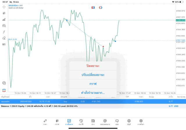 คลิ๊กค้างบนการเทรดที่ต้องการปิด แล้วเลือก ปิด
