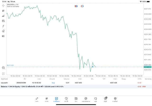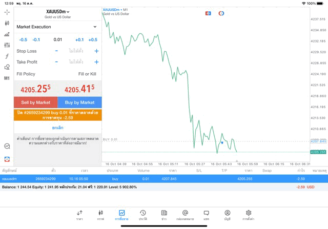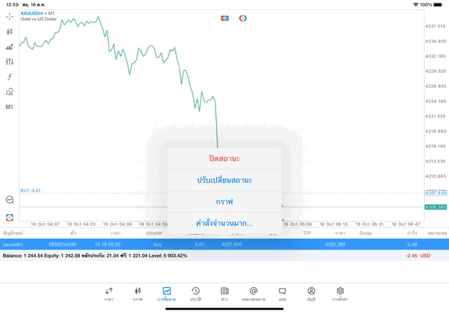 คลิ๊กปุ่มสีส้ม ปิดการเทรดทองคำครั้งนี้ ราคายังเปลี่ยนแปลงยังส่งผลต่อกำไรขาดทุนหากยังไม่คลิ๊กปิดสถานะ